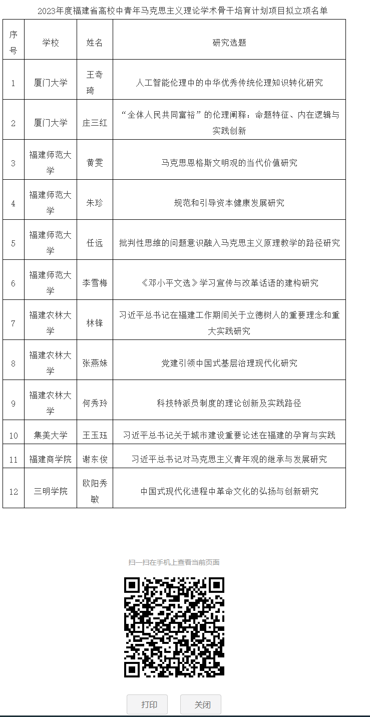 喜讯: 根据《中共福建省委宣传部、中共福建省委教育工委、福建省社会科学界联合会关于实施2023年度福建省高校中青年马克思主义理论学术骨干培育计划项目申报工作的通知》(闽委教思〔2023〕19号)要求,经有关高校推荐、专家评审,拟立项厦门大学王奇琦的“人工智能伦理中的中华优秀传统伦理知识转化研究”等12项高校中青年马克思主义理论学术骨干培育计划项目,米兰官网谢东俊老师习近平总书记对马克思主义青年观的继承与发展研究获得立项。