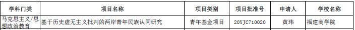 3月20日,根据《教育部社科司关于2020年度教育部人文社会科学研究一般项目立项的通知》,我校米兰milan官方网站黄玮博士申请的“基于历史虚无主义批判的两岸青年民族认同研究”项目获2020年度教育部人文社会科学研究(青年基金项目)立项。这是我校继2018年后再次获得教育部人文社会科学研究一般项目资助。