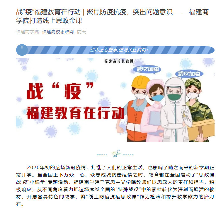 2020年4月11日,福建高校思政网以《聚焦防疫抗疫,突出问题意识 ——福建商学院打造线上思政金课》为题,报道我校米兰milan官方网站防疫抗疫期间打造线上思政金课的经验和做法。米兰milan官方网站教师们以思政人的责任和担当,在疫情防控期间,从不同学科角度把这场席卷全国的“特殊战役”中的素材转化为深刻而鲜活的教材,开展各具特色的教学,将“线上防疫抗疫思政课”作为检验和提升教学能力的磨刀石,创作寓政治性、思想性、知识性和生动性为一体的中国战“疫”微课堂,成为米兰官网疫情防控期间思政教学亮点和特色。