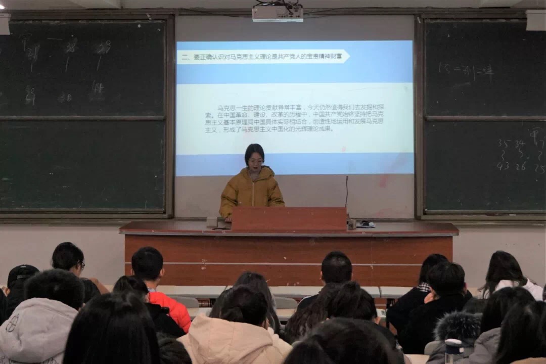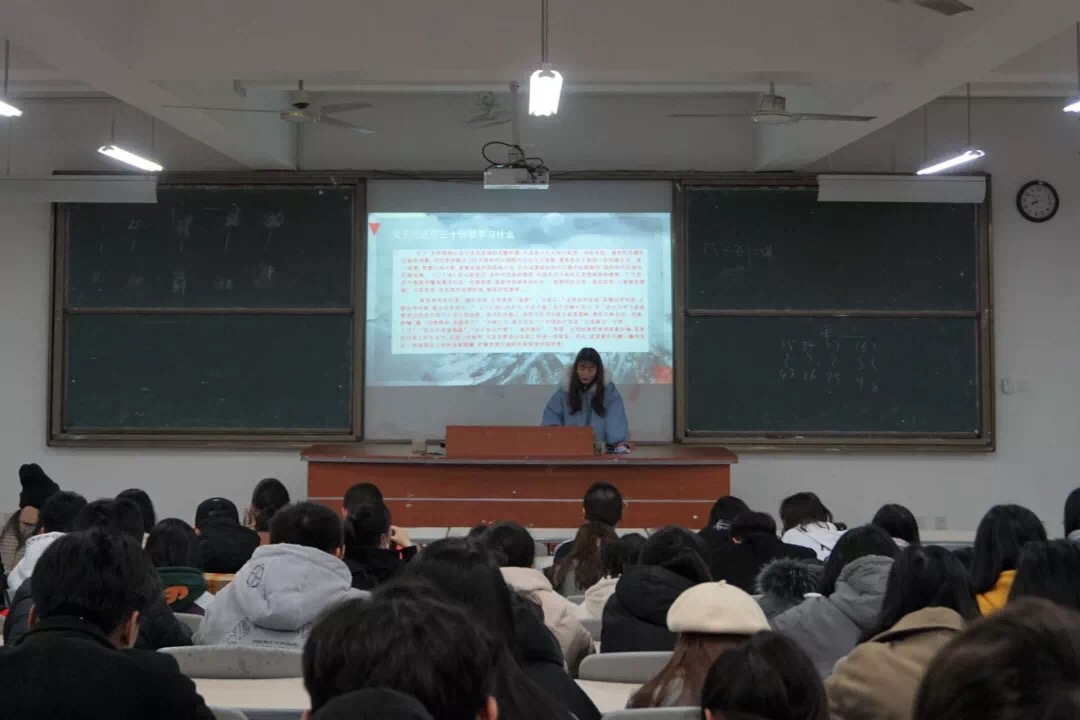 12月28日晚,福建商学院习近平新时代中国特色社会主义思想读书社大学生宣讲小分队于连江校区诚信楼中阶二教室举行本学期第六场宣讲会。本次宣讲会由读书社骨干成员杜炣姌、郭春静两位同学为我校工管系和旅游系近100名同学进行宣讲。