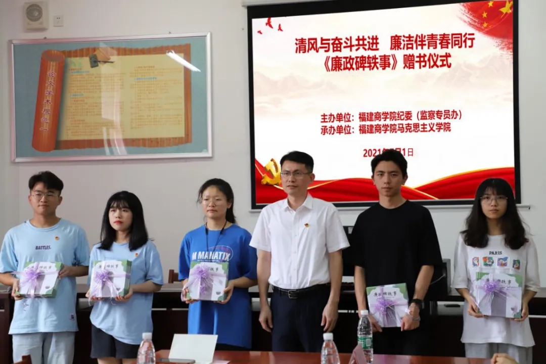 7月1日下午,校纪委(监察专员办)在我校习近平新时代中国特色社会主义思想读书社活动室举办“清风与奋斗并进 廉洁伴青春同行”赠书活动,校纪委书记、监察专员黄身勇向读书社学员代表赠送《廉政碑轶事》绘本。米兰milan官方网站党政负责人、艺术设计学院党组织负责人和校纪委综合室、纪检监察室等相关部门负责人参加活动。